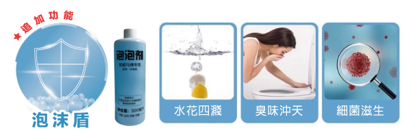 在座廁水封表面噴上一層防濺泡沫隔離層,能有效隔離排泄物臭味,同時擁有良好防粘、自潔、潤壁、殺菌、清新空氣等功能,減少衛生間的細菌滋生及擴散,更好的呵護人體健康。