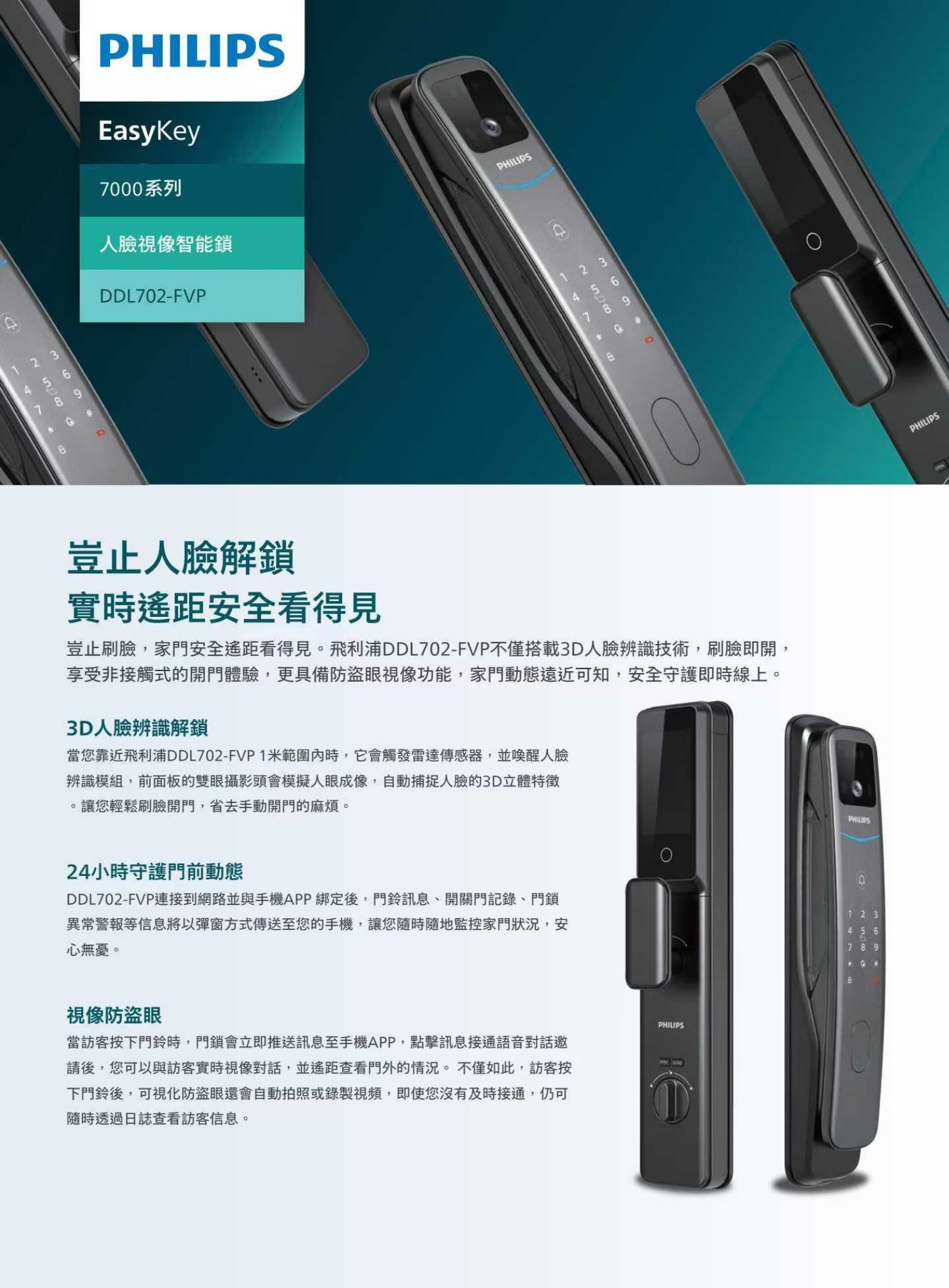 Philips / 飛利浦 / EasyKey / DDL702-FVP / 人臉解鎖 / 即時視像通話 / 智能電子門鎖